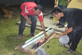 Sang jejaka semua berusaha menghidupkan api utk BBQ....lokasi awal kat sebelah umah Ida...kawasan tu lapang..sesuai la berkumpul reramai...tp bila tgh dok bakar membakar tu hujan mula menitis...maka lokasi harus bertukar dengan segera ke bawah porch umah abah aku lak...